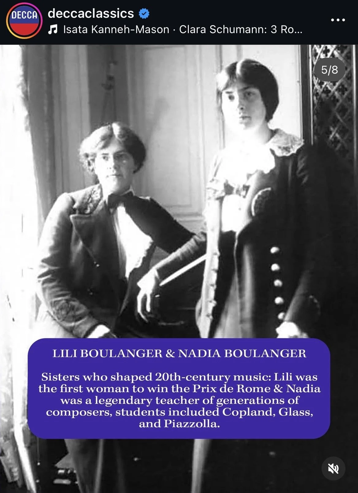 You might be able to call this next one more "sloppy" than "incorrect", if you were being charitable: It’s customary to name people who appear in a picture from left to right, and in the case of the Boulanger sisters, Nadia is on the left and Lili on the right, with the names reversed in the text. I suspect whoever made this post for Decca Classics (an intern with LLM access?) didn’t know which sister was which by their photos, and/or did not care.
