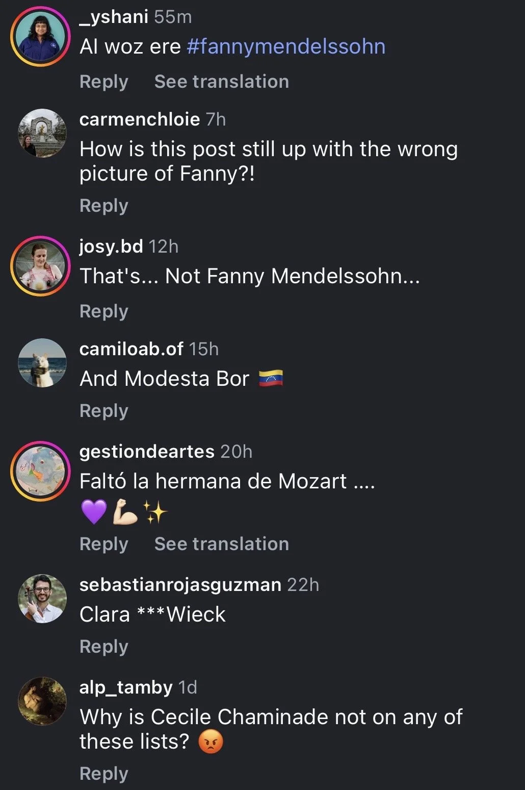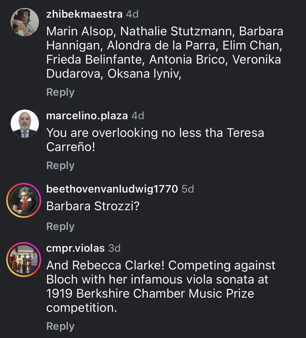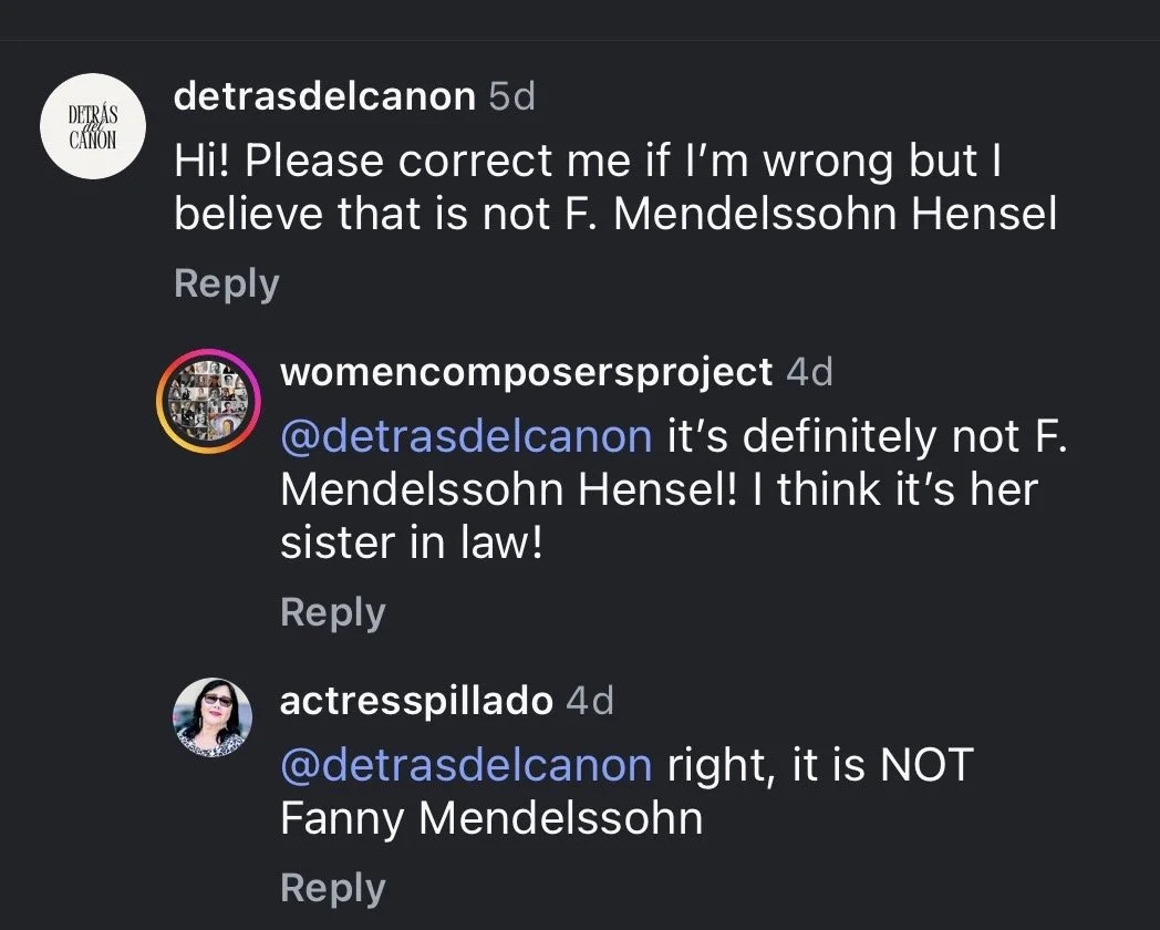 But the real hope-giving aspect of this saga for me is this: By the time I found Decca Classics’ post on Instagram, a day or two after it had been posted, a majority of the comments were critical of the post in some way or another. They were either calling out the incorrect Hensel image or complaining about the focus on such a limited number of women composers, when there are so many more that are rarely or never recognized by the mainstream.