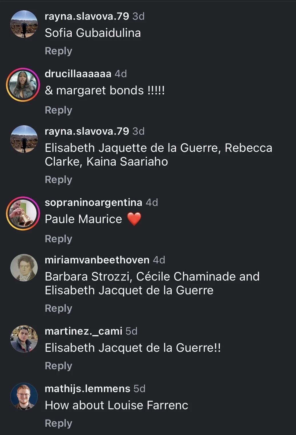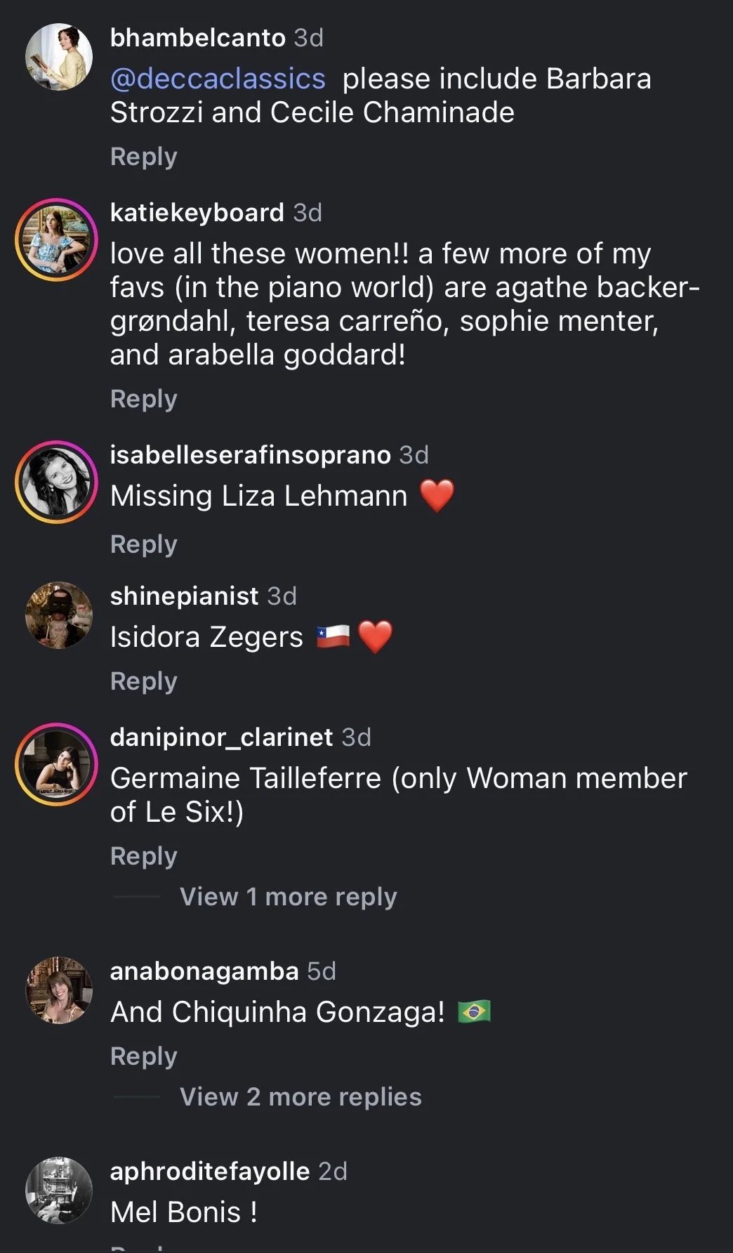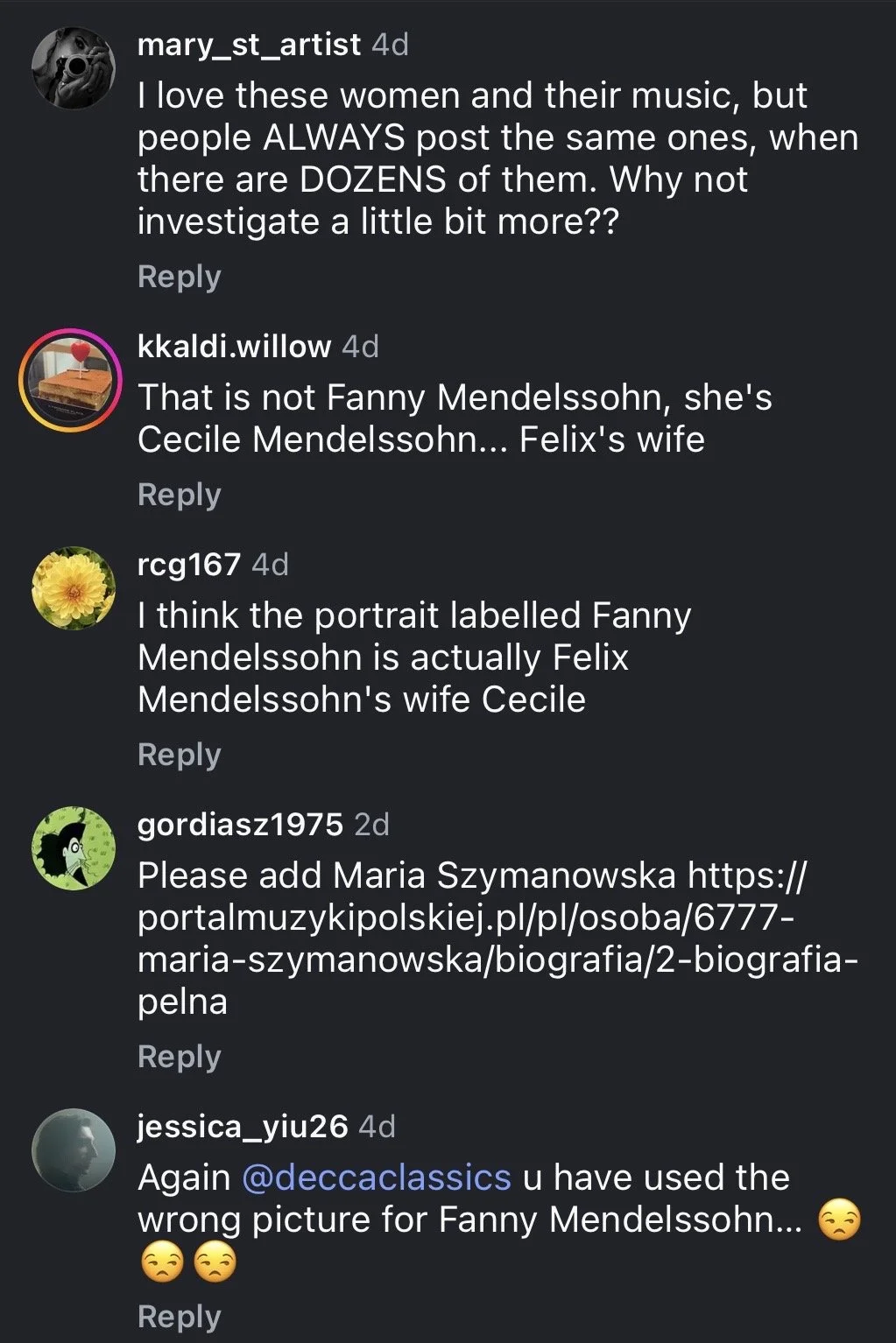 But the real hope-giving aspect of this saga for me is this: By the time I found Decca Classics’ post on Instagram, a day or two after it had been posted, a majority of the comments were critical of the post in some way or another. They were either calling out the incorrect Hensel image or complaining about the focus on such a limited number of women composers, when there are so many more that are rarely or never recognized by the mainstream.